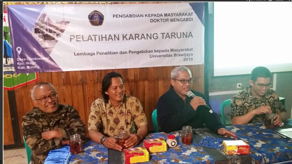 “Program Doktor Mengabdi Universitas Brawijaya ini dilaksanakan selama Enam bulan sejak bulan Juli 2018 yang diorientasikan untuk menemukan solusi berupa peningkatan kapasitas kelembagaan Karang Taruna dengan melakukan penataan kelembagaan dan manajemen kegiatan usaha bisnis,” ujar Ketua Tim Doktor Mengabdi LPPM UB, Aan Eko Widiarto.