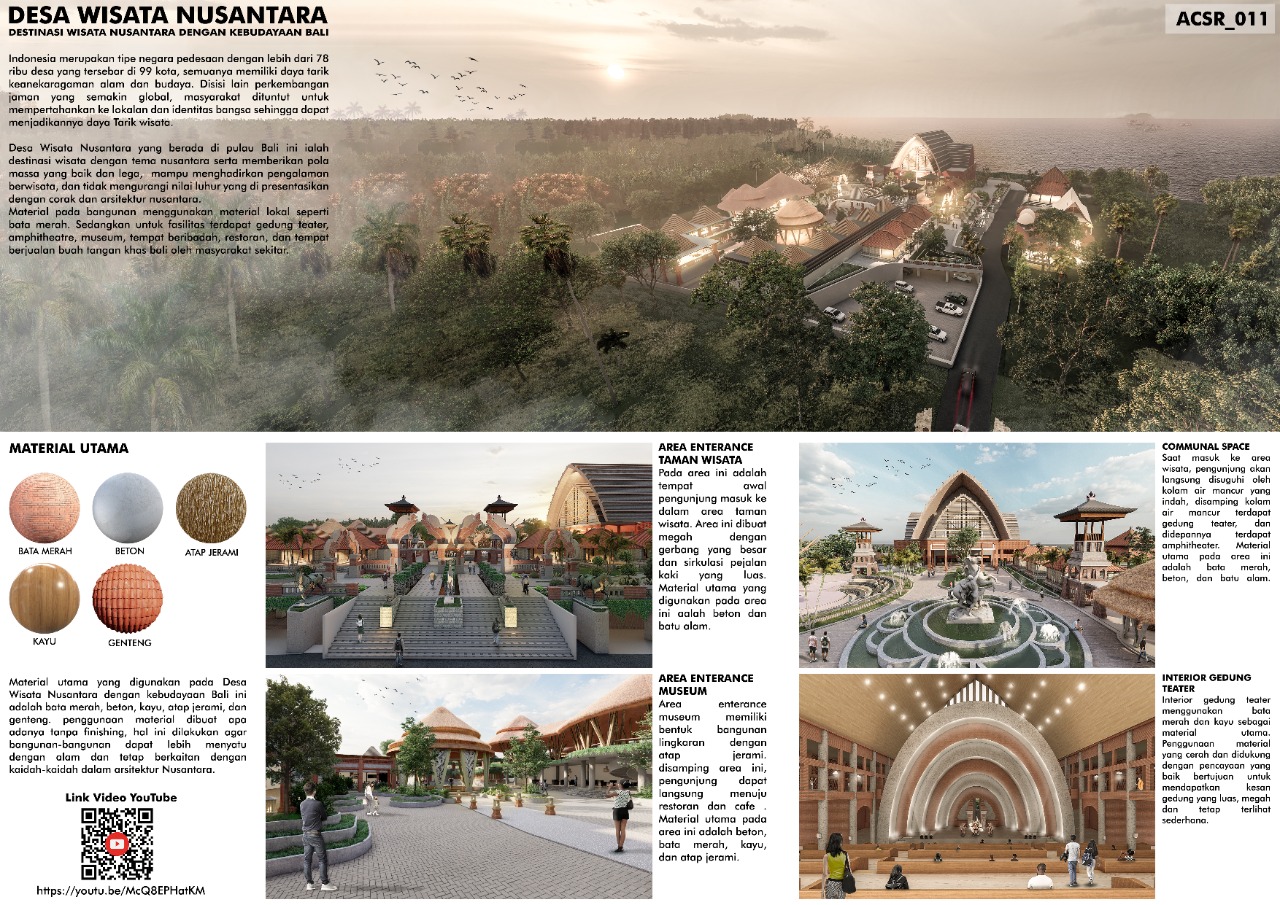 Karya mahasiswa ITN Malang tersebut disajikan dalam bentuk video animasi berdurasi tiga menit dan panel poster yang menceritakan Desa Wisata Nusantara di Pulau Bali sebagai destinasi wisata dengan tema nusantara, serta memberikan pola massa yang baik dan lega.