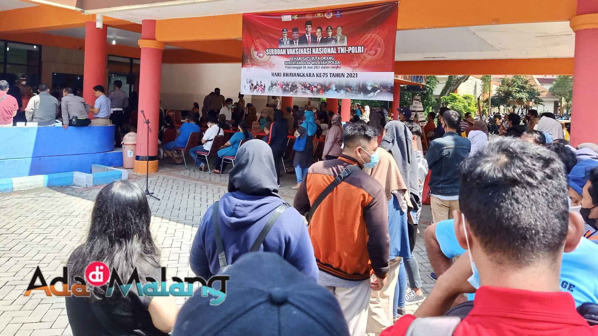 ADADIMALANG – Dalam rangkaian peringatan HUT Bhayangkara ke 75, secara serentak dilaksanakan program vaksinasi masal hari ini. Salah satunya adalah di kota Malang yang ditempatkan di gedung Sasana Krida Universitas Negeri Malang (UM) mulai pagi hari tadi, Sabtu (26/06/2021).