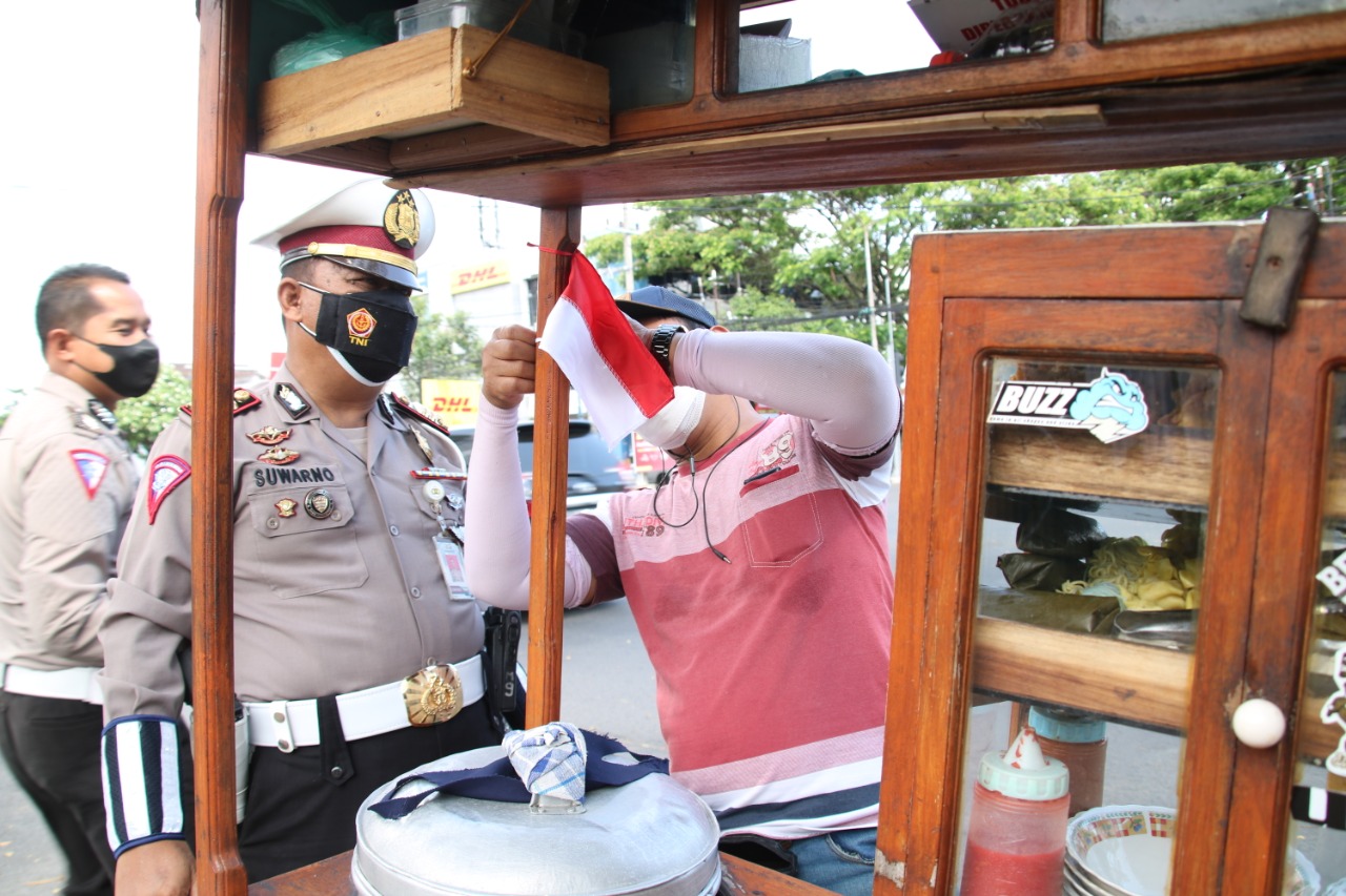Selain membagikan bendera merah putih kecil dan masker, personel Satlantas Polresta Malang Kota juga membagikan selebaran PPKM Level 4 yang dilaksanakan juga di wilayah Kota Malang saat ini.