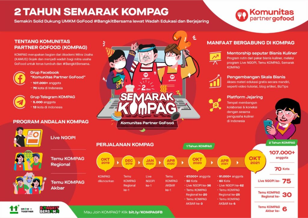 Berkat kegigihan mitra UMKM serta dukungan GoFood, rata-rata pendapatan bulanan mitra UMKM kuliner yang bergabung di masa pandemi hingga kini (Q2 2020 – Q3 2021) meningkat hingga tujuh kali lipat. Inilah yang terus memotivasi kami untuk berinovasi dan memperkuat wadah edukasi serta berjejaring KOMPAG,” imbuh Catherine.