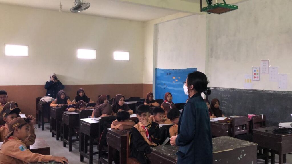 Dosen Pendamping dari FISIP UB Isma Adila, S.I.Kom, M.A dan mahasiswa FISIP Embun Nada Pawestri menyampaikan materi tentang urgensi vaksinasi pada usia sekolah dasar dan mengenai teknis Pembelajaran Tatap Muka (PTM) paska vaksinasi.