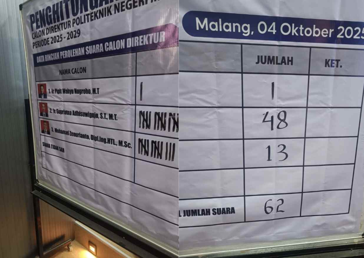 Dalam Sidang Tertutup, komposisi suara dibagi antara Senat POLINEMA (65 persen) dan pihak Kemendikti Saintek (35 persen). Total 62 suara, yang terdiri dari 40 suara Senat dan 22 suara Kementerian, menghasilkan keputusan Ir. Supriatna Adhisuwignjo, S.T., M.T., berhasil meraih suara terbanyak yakni 48 suara, Mohammad Zaenurianto, Dipl.Ing.HTL., M.Sc., memperoleh 13 suara dan Ir. Pipit Wahyu Nugroho, M.T., hanya mendapatkan 1 suara.
